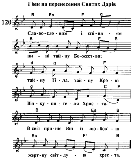 Гімн на перенесення Пресвятих Дарів2. Нам дарований із лона Діви Чистої у світ, / в цьому світі Він засіяв нам любові дивний цвіт, / і завершенням закону нам відкрив Новий Завіт. 3. Під час Тайної Вечері Він любов свою явив, / як Отцю разом з учнями Він молитву сотворив, / Найсвятішими Руками Хліб із нами преломив. 4. Плоттю справжнього Ісуса став укритий хліб в той час, / і вино Господнім Словом претворилось в Кров ураз, / серце чистеє готове вірить скритому від нас. 5. За святую Тайну віри преклоняємося Богу, / поступись, Старий Завіте, місцем для Нового. / Серце правдою зігріте хай шукає Бога. 6. Тож хвала Отцю і Сину, й Духові Святому, / величання наші линуть Господу благому. / Наша дяка і пошана лиш Йому Одному. Т : "Pangc lingua" св. Т. Аквіпськнй П. : М. Луцюк М: григ.